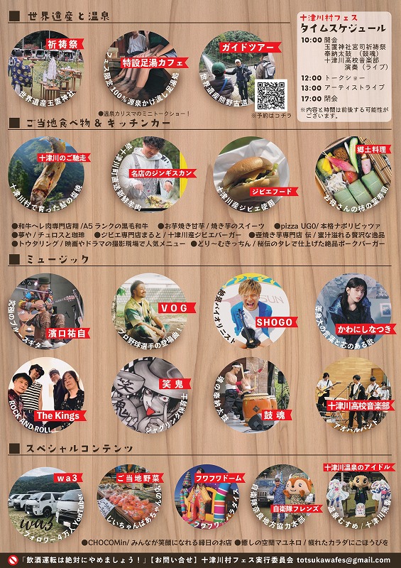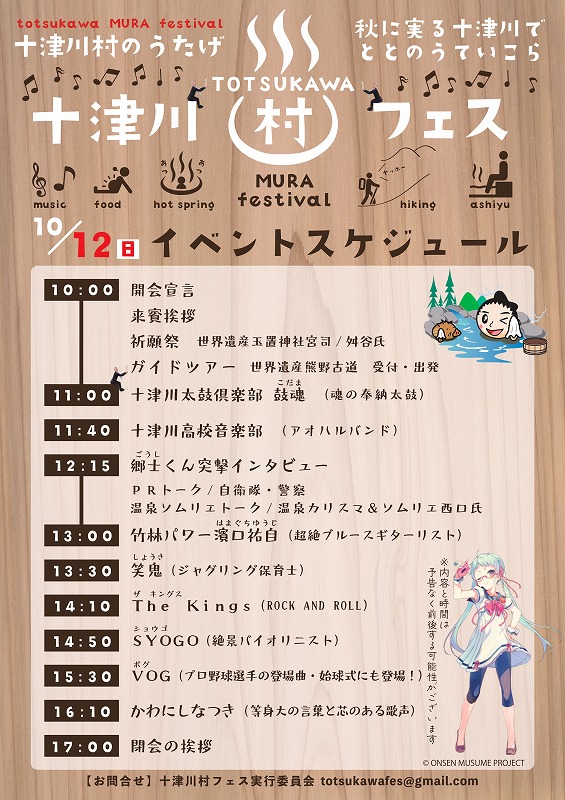スペシャルコンテンツ: 世界遺産ガイドツアー、音楽ライブ、ご当地野菜、温泉アイドル「十津川結心」など。