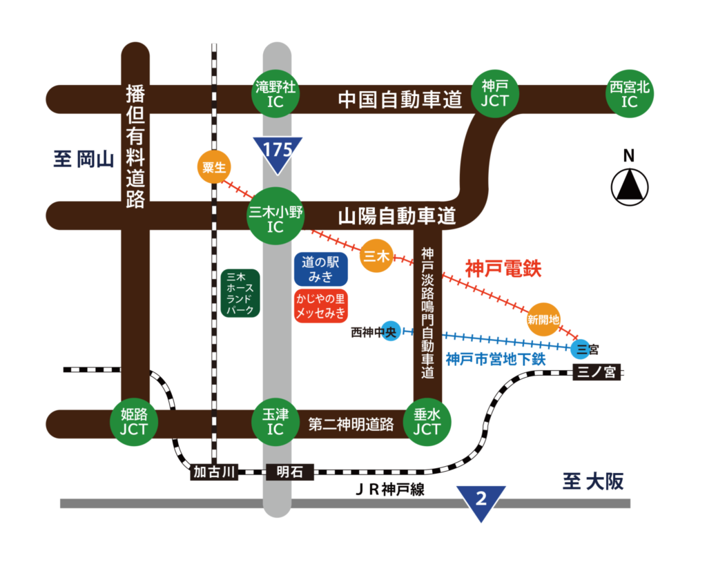 ・「三木小野インター」降りて明石方面 国道175号へ(約5分)